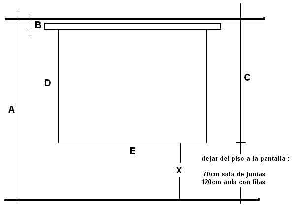 A la altura total de piso a techo "A" (o plafón) le debemos restar la altura de la carcaza de la pantalla (de 10 a 15cm) y lo que vayamos a dejar entre la carcaza y el techo "B". También debemos restar la altura que debemos respetar del piso al inicio de la proyección "X", la cual en el caso de una sala de juntas deben ser por lo menos 70cm, y en el caso de un aula de capacitación o salón de clases mínimo 1.20m.