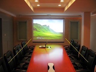 Cuando se trata de salas, además de los cálculos de la sección anterior, el ancho de la pantalla no debe ser mayor que la separación entre las personas de un lado de la mesa y del otro lado (líneas amarillas de la foto). Para calcular cual es esa distancia, se debe tomar el ancho de la mesa y sumarle 60cm. El ancho de la pantalla no debe ser mayor a esa distancia, de lo contrario, las personas no podrán ver la parte de la proyección que les estorbe las personas que estén en su mismo lado de la mesa.